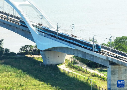 9月29日,列車通過福州濱??炀€烏龍江大橋(無人機(jī)照片)。(新華社記者 林善傳 攝)