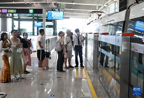 9月29日,人們?cè)跒I??炀€帝封江站等候前往福州長(zhǎng)樂國際機(jī)場(chǎng)的列車。(新華社記者 林善傳 攝)