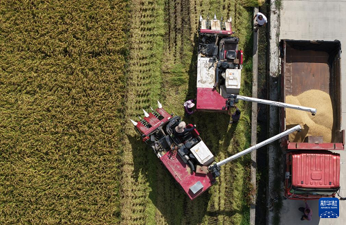 10月10日,湖北省宜昌市秭歸縣沙鎮(zhèn)溪鎮(zhèn)長春村村民駕駛農(nóng)機在田間收獲水稻。(新華社發(fā) 王罡 攝)