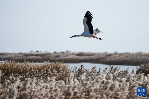 11月13日,在黃河三角洲國(guó)家級(jí)自然保護(hù)區(qū),白鸛在飛翔。(新華社記者 朱崢 攝)