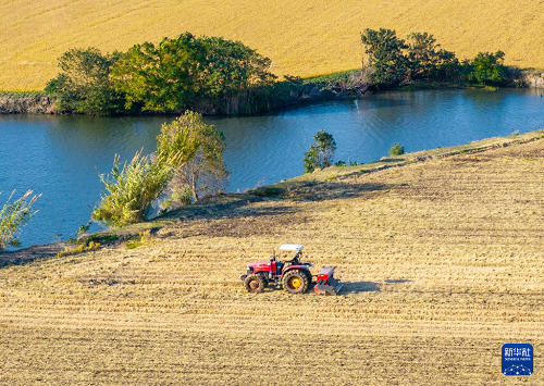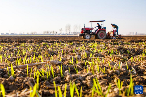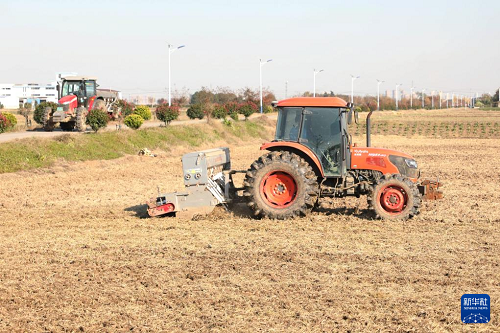 11月19日,在河南省商丘市睢縣鳳城街道劉樓村一處農(nóng)田內(nèi),農(nóng)機手駕駛播種機播種冬小麥。(新華社發(fā) 徐澤源 攝)