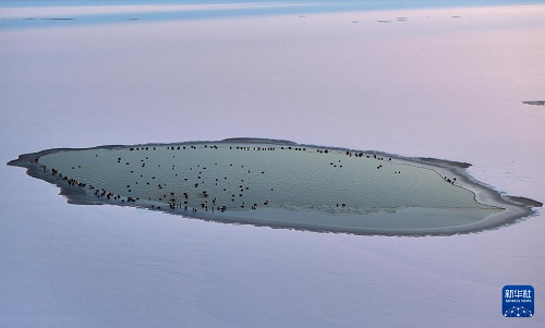 11月27日在松花江哈爾濱段拍攝的綠頭鴨寒江休憩、覓食場景(無人機照片)。(新華社發(fā) 張樹 攝)