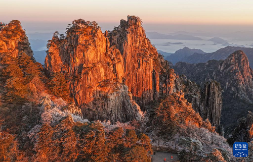 雪后初霽的安徽省黃山風(fēng)景區(qū)銀裝素裹,初升的朝陽(yáng)與奇松、怪石交相映襯,吸引眾多游客前來(lái)賞雪觀景。