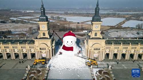 12月14日拍攝的建設(shè)中的哈爾濱市群力音樂公園網(wǎng)紅大雪人(無人機(jī)照片)。(新華社發(fā) 劉洋 攝)