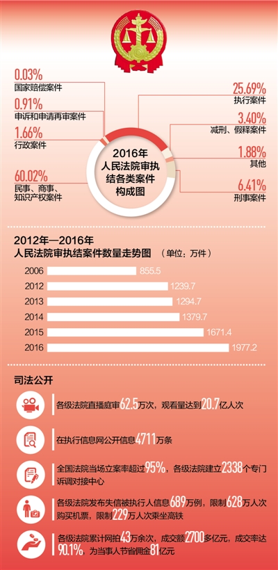 2016年,各級(jí)法院向執(zhí)行難全面宣戰(zhàn),共受理執(zhí)行案件614.9萬(wàn)件,執(zhí)結(jié)507.9萬(wàn)件,同比分別上升31.6%和33.1%,執(zhí)行到位金額1.5萬(wàn)億元,同比上升54%。與公安部等10多個(gè)部門(mén)建立網(wǎng)絡(luò)執(zhí)行查控系統(tǒng),執(zhí)行法官足不出戶(hù)即可依法查詢(xún)被執(zhí)行人財(cái)產(chǎn)和相關(guān)信息,實(shí)現(xiàn)了執(zhí)行模式的根本變革。發(fā)布失信被執(zhí)行人信息689萬(wàn)例,限制628萬(wàn)人次購(gòu)買(mǎi)機(jī)票,限制229萬(wàn)人次乘坐高鐵。依法懲治拒不執(zhí)行裁判行為,司法拘留1.6萬(wàn)人,追究刑事責(zé)任2167人,讓司法裁判真正成為懲治違法失信的利劍。
