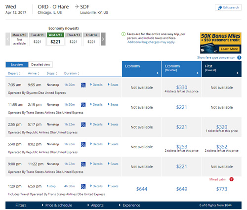 圖說:記者在美聯(lián)航官網(wǎng)搜索奧黑爾國際機(jī)場飛往肯塔基州路易斯維爾的航班。