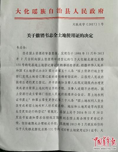 2月9日,大化縣人民政府下發(fā)大政處字〔2017〕1號文《關(guān)于撤銷韋志全土地使用證的決定》。 中國青年報(bào)·中青在線記者 謝洋/攝