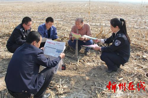 怎樣把《中華人民共和國(guó)大氣污染防治法》和《五臺(tái)縣人民政府嚴(yán)防森林火災(zāi)的通告》宣傳到人?五臺(tái)縣環(huán)境保護(hù)局、環(huán)境監(jiān)察大隊(duì)分組劃片,組織環(huán)保人員深入到田間地頭,面對(duì)面讀報(bào)給農(nóng)民聽(tīng),手遞手散傳單讓農(nóng)民看,為農(nóng)民解釋燒秸稈、燒地堰、燒荒等野外違規(guī)用火行為的危害。臺(tái)城鎮(zhèn)西關(guān)村66歲的農(nóng)民張存在就高興地對(duì)縣環(huán)境監(jiān)察人員說(shuō):“你們這樣解釋?zhuān)鄱暗仡^環(huán)?!痹坜r(nóng)民也記得牢,我家4畝地的秸稈保證不燒一根,咱漚糞去,多打糧,又不污染?!眻D為地頭宣傳環(huán)境保護(hù),增強(qiáng)農(nóng)民環(huán)保意識(shí)。(金俊賢 攝)
