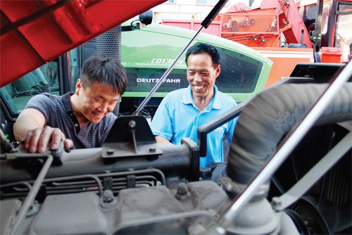 7 月13 日,兩位農(nóng)民在原平市農(nóng)機公司選購拖拉機。近年來,原平市落實各項惠農(nóng)政策,極大地調(diào)動了農(nóng)民購買和使用農(nóng)機具的積極性,在小麥收割接近尾聲之際,農(nóng)民抓緊時間選購拖拉機等國家補貼農(nóng)機具,為在麥田地里進行夏播做準備。(褚震 攝)