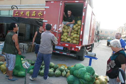 暑期天氣赤日炎炎,8月7日,原平市德金集貿(mào)瓜果蔬菜市場大西瓜貨豐價穩(wěn)購銷兩旺,市民們紛紛購買防暑解熱。(趙春曉 攝)