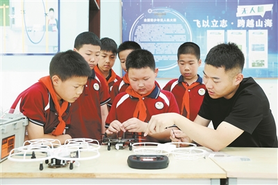 江蘇省宿遷市洋河新區(qū)實驗小學(xué)師生進行無人機組裝與拆卸維修。