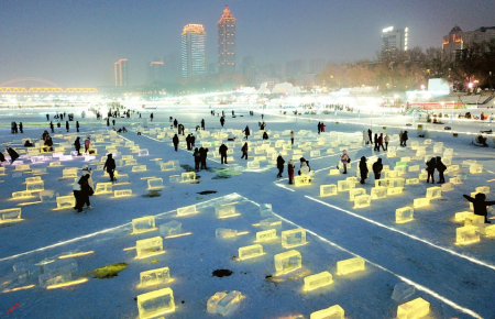 游客在哈爾濱松花江冰雪嘉年華景區(qū)的“冰光秀場”游玩、拍照(無人機照片,1月3日攝)。