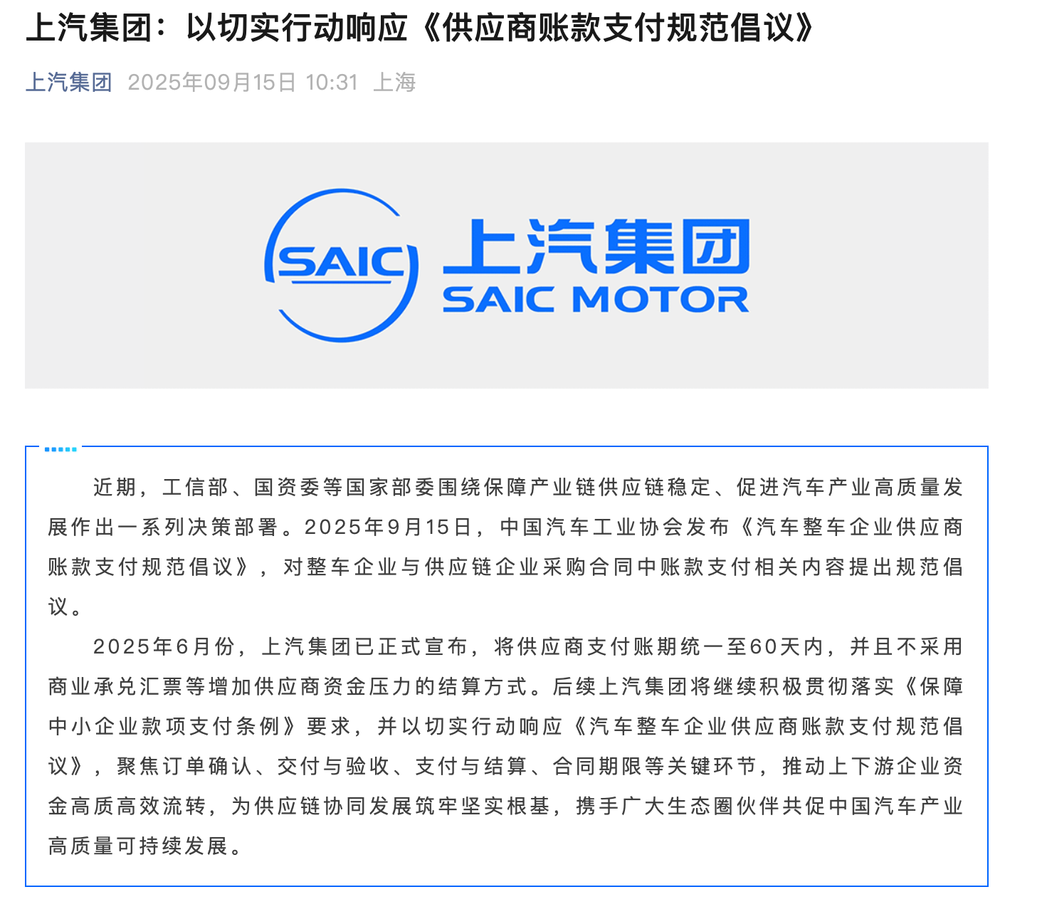 央廣網(wǎng)北京9月15日消息(記者董楠)9月15日,中國汽車工業(yè)協(xié)會(簡稱“中汽協(xié)”)發(fā)布《汽車整車企業(yè)供應商賬款支付規(guī)范倡議》,提出為了推動汽車行業(yè)落實《保障中小企業(yè)款項支付條例》,支持重點車企高質量踐行供應商賬期承諾,在充分協(xié)商的基礎上,對整車企業(yè)與供應商企業(yè)采購合同中賬款支付相關內(nèi)容作出規(guī)范倡議,規(guī)范涉及訂單確認、交付與驗收、支付與結算、合同期限多個環(huán)節(jié)。