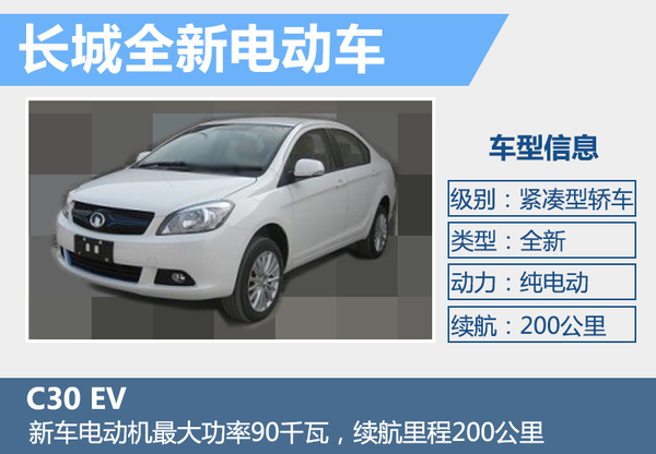 根據長城汽車此前公布消息,旗下首款純電動轎車將于2016年上市。網通社獲得了一組長城全新電動車型C30 EV的諜照及部分信息,新車外觀方面較燃油版車型在細節(jié)方面進行調整,加入更多“EV”元素。新車搭載一臺功率為90千瓦的電動機,續(xù)航里程有望達到200公里。