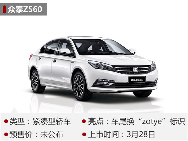 Z500是眾泰汽車旗下一款緊湊型轎車,其改款車型Z560將于3月28日正式上市。外觀方面,新車前臉保留雙橫幅式進氣格柵及鷹眼式前大燈組合,視覺效果比較大氣。而新車尾部則取消牌照框上方的Z型LOGO,更換為眾泰最新的“zotye”字樣標(biāo)識。內(nèi)飾方面,眾泰Z560儀表盤有所升級,增加了帶有行車電腦的中間液晶屏幕。新車將延用1.5T動力系統(tǒng),匹配5擋手動變速箱或CVT自動變速箱。其中,搭配手動變速箱車型最大功率將達(dá)105kW,峰值扭矩207Nm。