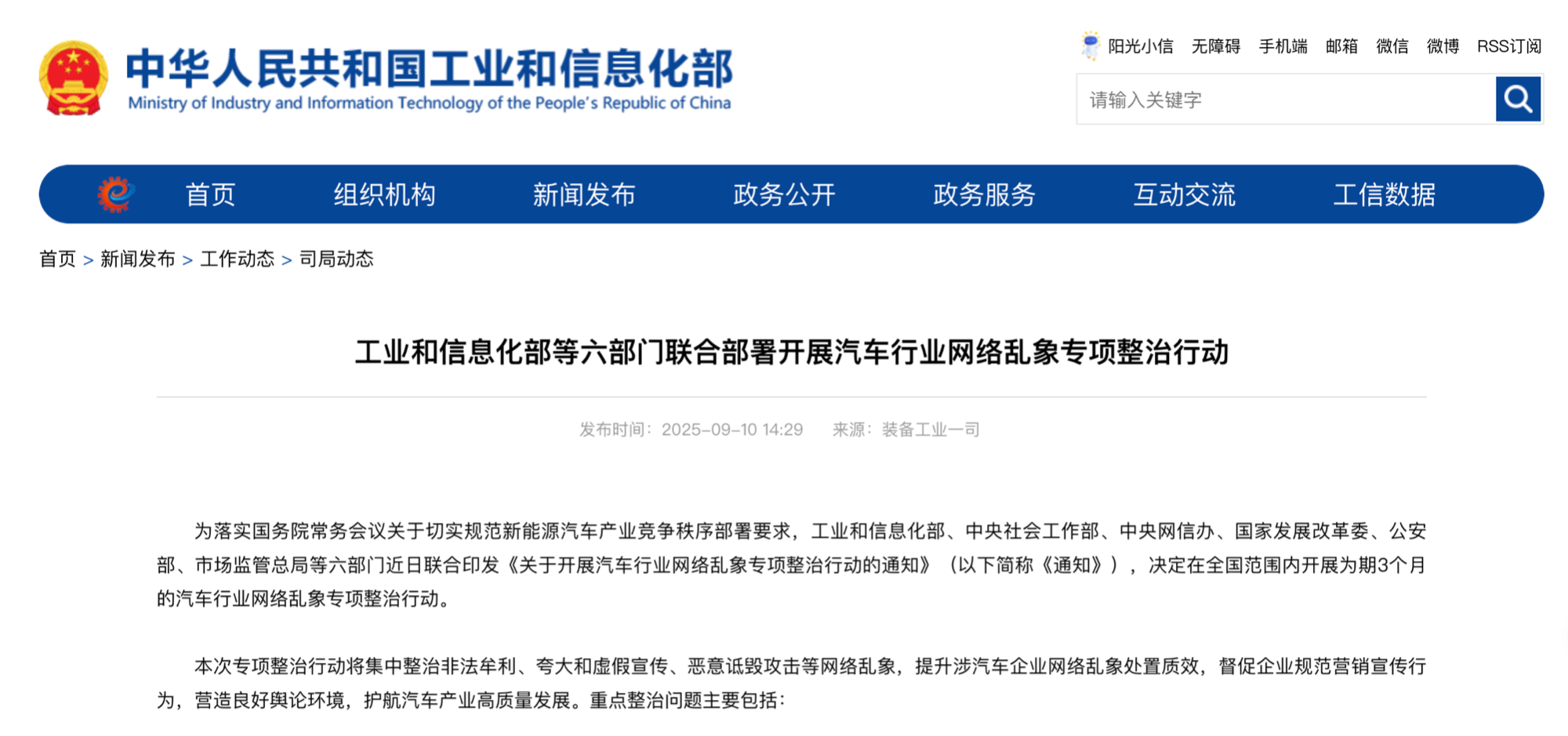 央廣網(wǎng)北京9月10日消息(記者董楠)9月10日,工業(yè)和信息化部(以下簡稱“工信部”)、中央社會工作部、中央網(wǎng)信辦、國家發(fā)展改革委、公安部、市場監(jiān)管總局等六部門聯(lián)合印發(fā)《關于開展汽車行業(yè)網(wǎng)絡亂象專項整治行動的通知》,決定在全國范圍內(nèi)開展為期3個月的汽車行業(yè)網(wǎng)絡亂象專項整治行動。