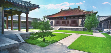 永安寺,原稱渾源州永安禪寺及神州大永安禪寺,俗稱“大寺”,始建于金,金元之交被火毀后重建,明、清以來均曾在當(dāng)?shù)毓賳T倡導(dǎo)下續(xù)建與增修。該寺位于渾源古城東北隅,坐西北朝東南,本為以中軸線為主,東西軸各輔以跨院或偏院的五進(jìn)場(chǎng)院空間大型寺廟建筑群,現(xiàn)僅存前院及東西跨院和中院主體建筑群,東西寬52米,南北深78米,占地面積4056平方米。寺內(nèi)現(xiàn)存文物建筑物7座、清代壁畫305.4平方米、建筑彩畫2118平方米,古代碑碣2方,石獅一對(duì)。主殿傳法正宗殿為元延祐二年(1315年)原構(gòu),是我國(guó)建筑史上廡殿頂建筑的杰作,殿內(nèi)滿堂水陸畫、建筑彩畫及殿頂五彩琉璃均保存完好且異常精美,聞名遐邇。