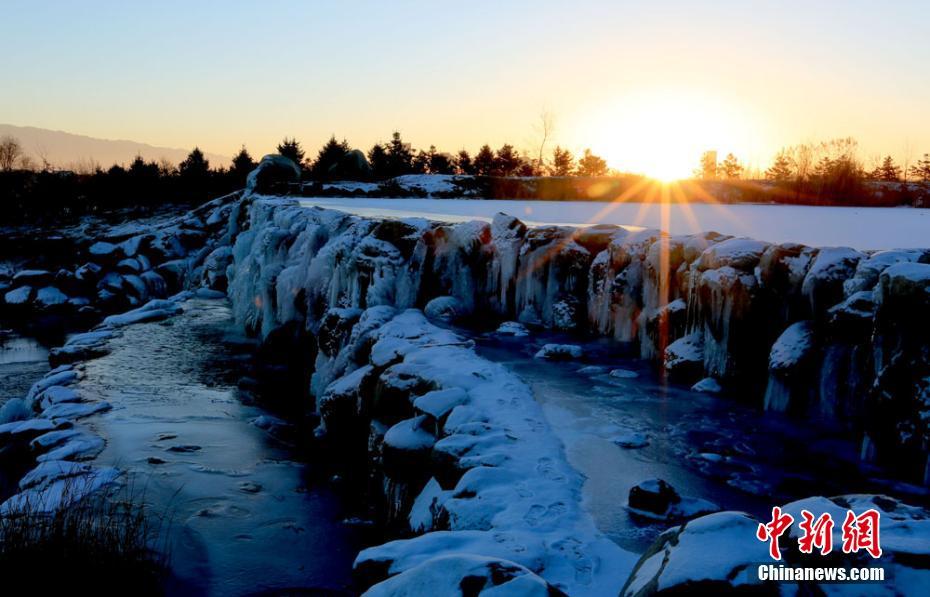寒冬時節(jié),雪后初晴,地處甘肅河西走廊的張掖市濱河新區(qū)人工湖被白雪覆蓋,涓涓細(xì)流形成晶瑩剔透的冰瀑、冰掛,成為冬日一景。 陳禮 攝