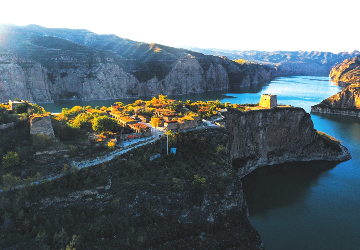 2015年的夏天,我又一次來到老牛灣,105米高的萬(wàn)家寨水電大壩飛跨晉蒙,黃河水在絕壁中安靜了、變綠了。老牛灣村前的小河倒灌進(jìn)了黃河水,一個(gè)灣成了兩個(gè)灣,團(tuán)團(tuán)地圍住了山村,又好似老牛彎出了兩個(gè)碧綠的牛角,太漂亮了。老鄉(xiāng)們說:“有企業(yè)來開發(fā)道路、景區(qū)了,也有北京游客開車來游玩了,拍照的多,照幾張相就走了?!蓖侨匀粴埰频拈T樓和石板院房,我不知該說什么、能說什么。