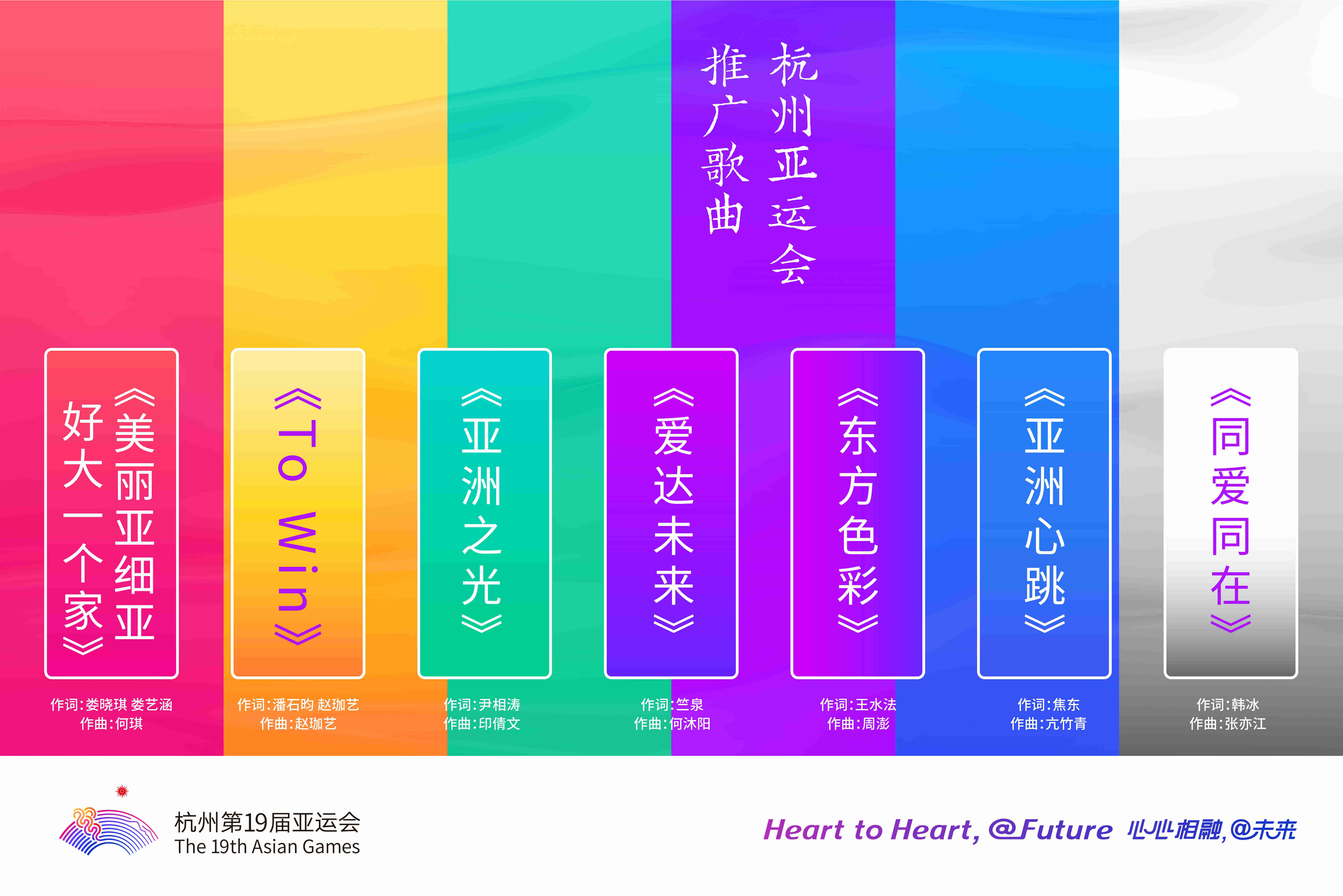 此次發(fā)布的《同愛(ài)同在》《亞洲心跳》《東方色彩》《愛(ài)達(dá)未來(lái)》《亞洲之光》《To Win》《美麗亞細(xì)亞 好大一個(gè)家》七首杭州亞運(yùn)會(huì)推廣歌曲彰顯了不同的音樂(lè)風(fēng)格,傳遞對(duì)亞運(yùn)盛會(huì)的祝福和期待。