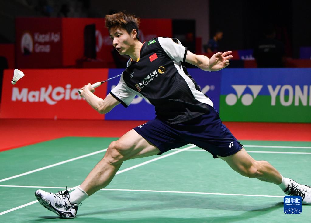 6月13日,石宇奇在雅加達(dá)舉行的2023年印度尼西亞羽毛球公開賽男單比賽中回球。新華社記者 徐欽 攝