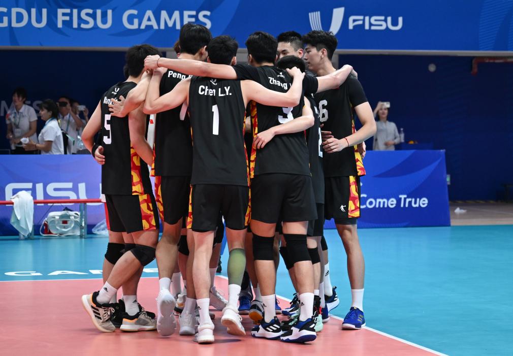 7月31日,中國(guó)男排球員在獲勝后慶祝。新華社記者 胥冰潔 攝