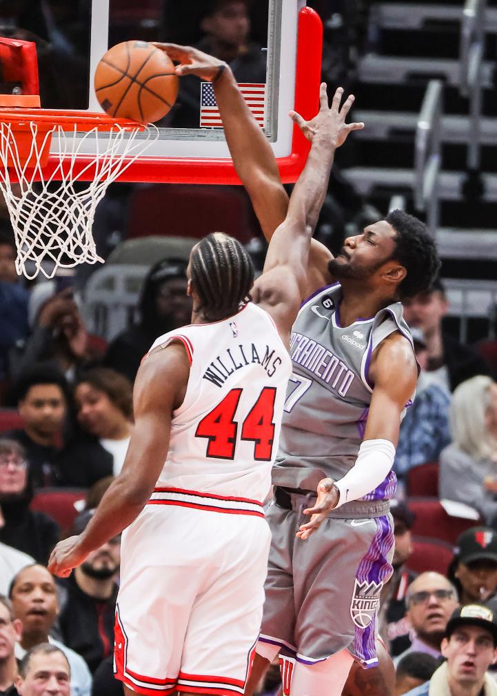 3月15日,效力于薩克拉門托國(guó)王隊(duì)的愛(ài)德華茲(右)在比賽中扣籃。當(dāng)日,在2022-2023賽季NBA常規(guī)賽中,薩克拉門托國(guó)王隊(duì)客場(chǎng)以117:114戰(zhàn)勝芝加哥公牛隊(duì)。新華社發(fā)(喬爾·萊納攝)