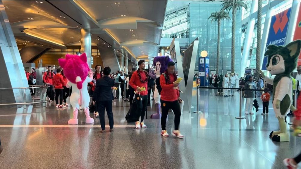 抵達(dá)多哈哈馬德國際機(jī)場時(shí),中國隊(duì)整體狀態(tài)顯得較為放松,多名教練員和球員主動與亞洲杯吉祥物擊掌。