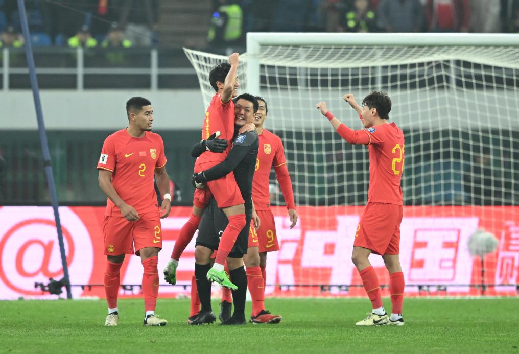 3月26日,中國隊守門員王大雷(左三)與中國隊球員韋世豪(左二)慶祝得分。新華社記者 孫凡越 攝