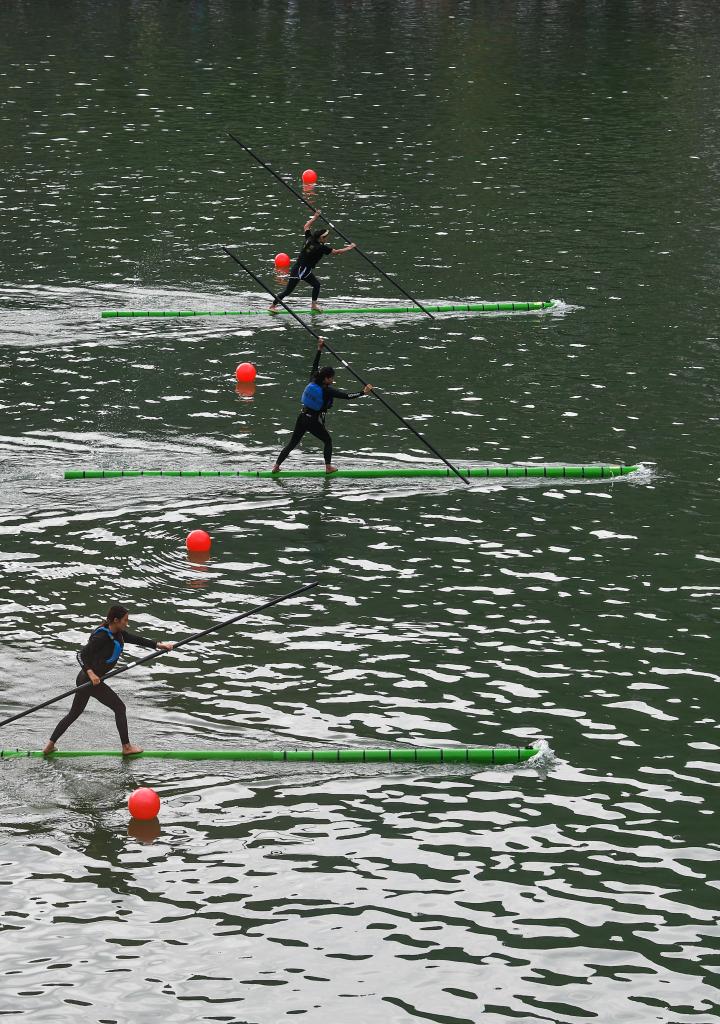 6月11日,選手在貴州省鎮(zhèn)遠縣?陽河上進行獨竹漂比賽。新華社記者 楊文斌 攝
