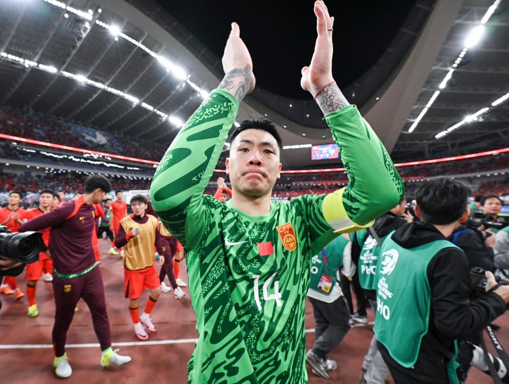 11月19日,在與日本隊(duì)的比賽后,中國(guó)隊(duì)守門(mén)員王大雷向球迷致意。新華社記者 姜克紅 攝