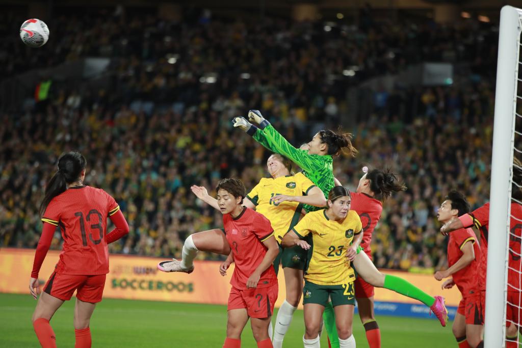 6月3日,在澳大利亞悉尼舉行的中澳女足友誼賽中,中國(guó)隊(duì)守門(mén)員徐歡(上)在比賽中撲救。新華社記者 馬平 攝