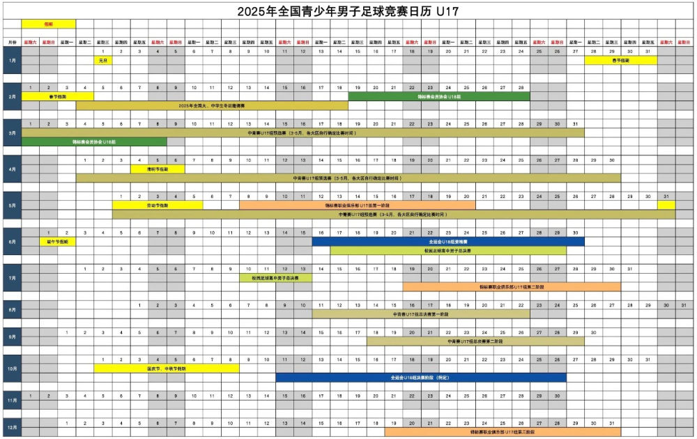中國(guó)足協(xié)此次發(fā)布的統(tǒng)一賽歷涉及男子U13至U18共6個(gè)年齡段和女子U14至U18共5個(gè)年齡段的球員,包含中青賽、體校杯、職業(yè)俱樂(lè)部梯隊(duì)的比賽、校園足球高中男女總決賽等。不同賽事用不同顏色標(biāo)注,在表格中一目了然。中國(guó)足協(xié)青少部負(fù)責(zé)人程旭表示,這份賽歷是各部門共同推進(jìn)的結(jié)果,不僅有助于賽事統(tǒng)籌和優(yōu)化,也能更好地凝聚力量,完善人才培養(yǎng)。