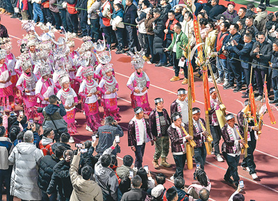 1月4日,發(fā)源于貴州省黔東南苗族侗族自治州榕江縣的“村超”正式拉開第三屆賽事的序幕。圖為拉拉隊(duì)參加入場巡游。新華社記者 楊文斌攝