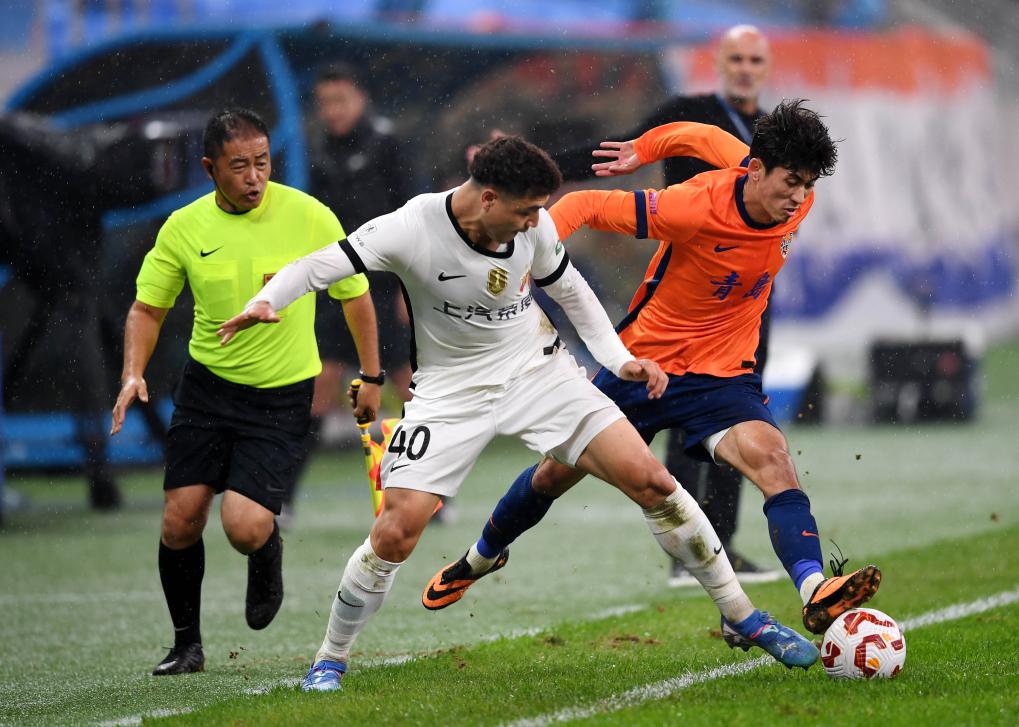 10月17日,上海海港隊球員吾米提江·玉蘇普(前左)在比賽中與青島海牛隊球員買烏郎·米吉提拼搶。當日,在山東青島舉行的2025賽季中超聯賽第27輪比賽中,上海海港隊客場4:3戰(zhàn)勝青島海牛隊。新華社記者 李紫恒 攝
