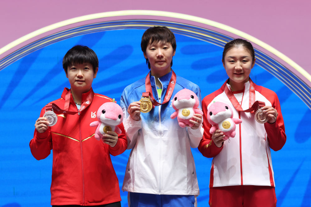 11月16日,冠軍黑龍江隊(duì)選手王曼昱(中)、亞軍河北隊(duì)選手孫穎莎(左)和季軍山東隊(duì)選手陳夢在頒獎儀式上合影。新華社記者 梁旭 攝
