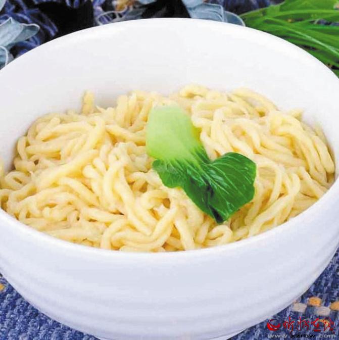 豆面稍加白面制成的豆面河撈是五寨當?shù)氐奶厣s糧主食,經(jīng)特制的河撈床下到鍋里,待面壓到一定長度,截斷面條,煮熟后配上各種澆頭,吃著筋滑利口。(張志遠)