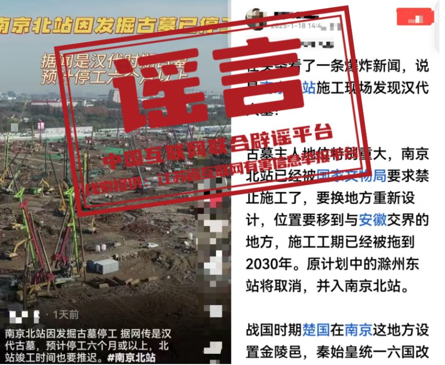 真相:近日,有網(wǎng)民在網(wǎng)絡(luò)平臺發(fā)帖稱,南京北站因挖到古墓,“已經(jīng)被國家文物局要求禁止施工了”“預(yù)計停工六個月或以上”“施工工期已經(jīng)被拖到2030年”等。經(jīng)江蘇省互聯(lián)網(wǎng)辟謠平臺與省文物部門和屬地核實(shí),目前沒有收到國家文物局關(guān)于“南京北站禁止施工”的有關(guān)通知,南京北站除個別涉及考古發(fā)掘作業(yè)區(qū)域外,其他施工作業(yè)均按計劃正常有序推進(jìn),網(wǎng)傳信息系謠言。(來源:江蘇省互聯(lián)網(wǎng)辟謠平臺、“南京網(wǎng)絡(luò)辟謠”微信公眾號)