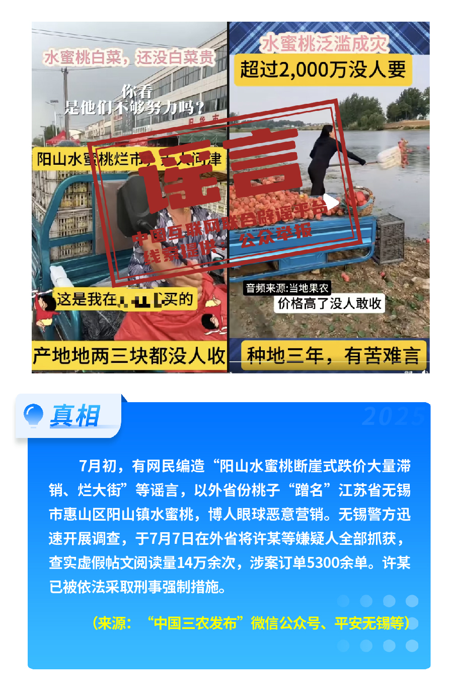 此外,7月份正值暑期旅游旺季和水果等農(nóng)產(chǎn)品收獲季,有自媒體、商家借機(jī)編造傳播涉文旅及農(nóng)產(chǎn)類謠言,干擾市場秩序,侵害消費(fèi)者權(quán)益。有商家違規(guī)使用人民大會(huì)堂建筑圖片標(biāo)識(shí)和名稱,仿冒人民大會(huì)堂賬號(hào),非法售賣、倒賣參觀門票,損害游客權(quán)益。個(gè)別商家剪輯發(fā)布“江蘇無錫陽山水蜜桃斷崖式跌價(jià)、大量滯銷、爛大街”謠言視頻,再借機(jī)兜售假冒的陽山水蜜桃,博人眼球惡意營銷,擾亂市場秩序。所謂“峨眉山人猴大戰(zhàn),游客墜崖,猴王被當(dāng)場擊斃”景區(qū)安全事件一度傳得沸沸揚(yáng)揚(yáng),相關(guān)視頻以驚悚情節(jié)博取關(guān)注,畫面實(shí)際是用AI合成拼接制作。