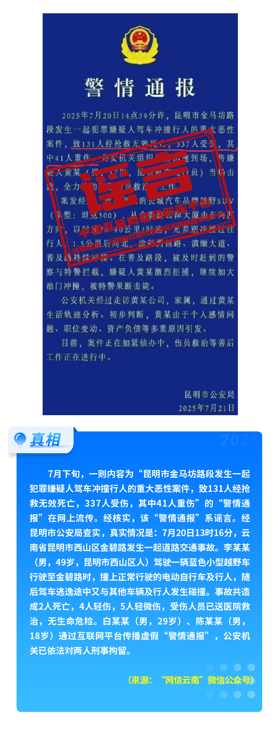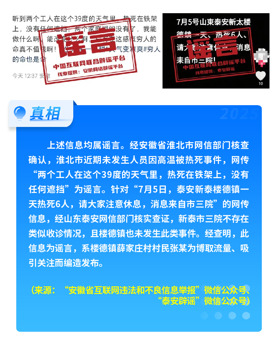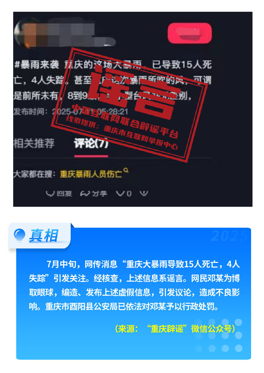 近期,網(wǎng)上接連出現(xiàn)發(fā)布虛假“警情通報(bào)”的惡性造謠傳謠案件,炮制傳播“昆明駕車撞人案131人死亡”“杭州自來水接入糞水”及涉釋永信虛假“警情通報(bào)”,模仿“藍(lán)底白字”格式,杜撰聳人聽聞細(xì)節(jié),損害政府公信力,嚴(yán)重?cái)_亂社會(huì)秩序?!霸菏款A(yù)測廣東將發(fā)生8級(jí)以上大地震”公然偽造專家聊天截圖,謊報(bào)地震預(yù)警。還有造謠者借盛夏高溫酷暑與洪澇災(zāi)害,編造“安徽淮北、山東泰安等地多人因高溫死亡” “重慶大暴雨導(dǎo)致15人死亡、4人失蹤”等謠言,蹭炒熱點(diǎn)、煽動(dòng)情緒。