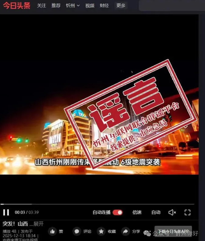 2025年12月13日,有網(wǎng)民發(fā)布“突發(fā)!山西忻州遭遇6級地震,多地震感強(qiáng)烈”等不實信息,引發(fā)網(wǎng)民關(guān)注。