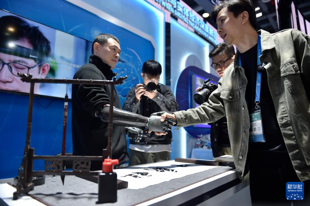 在展位現(xiàn)場(chǎng),另一名上肢截肢的人士在使用強(qiáng)腦科技推出的智能仿生手。這也是基于非侵入式腦機(jī)接口技術(shù)的產(chǎn)品。使用者利用智能仿生手不但可輕松取物,還能寫毛筆字。