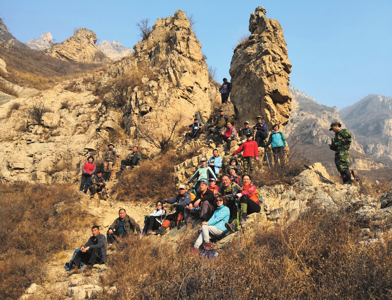 走過(guò)一片荊棘林,忽遇一塊巨石,之后眼前豁然開(kāi)朗。放眼望去,群山環(huán)繞,松濤陣陣,紅葉、黃葉、綠葉相間,層林盡染,秋意濃濃。美景讓大家暫時(shí)忘記了疲勞!