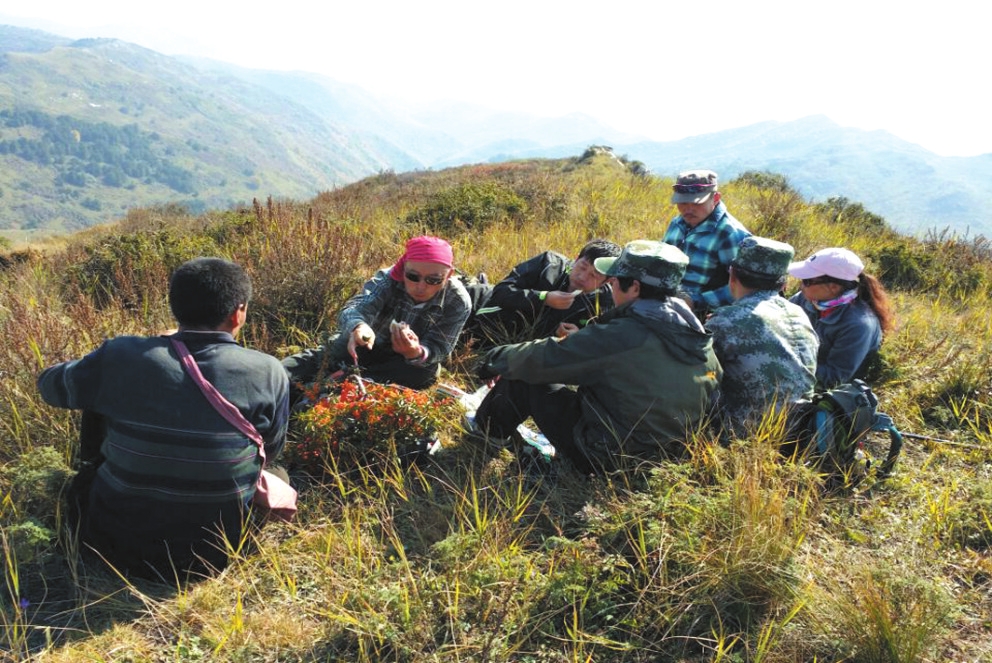 再向前,是一片更茂密的荊棘林,坡度更陡了,大家顧不得叢林中有刺,相互攙扶著向前走。上面是刺人的荊棘,下面是萬(wàn)丈深淵,腳下的草有點(diǎn)濕滑,一旦踩空,可能粉身碎骨。羊倌一直提醒注意腳下,踩實(shí)了再邁步,真是心驚膽戰(zhàn)。幸好前面出現(xiàn)了一處空地,大伙得以小憩,喝點(diǎn)水,補(bǔ)充一下體能。有三人主動(dòng)放棄登頂,大伙商議后,剩余十人決定繼續(xù)前進(jìn),完成登頂夙愿。三人原地守候,等大伙返回后會(huì)合。
