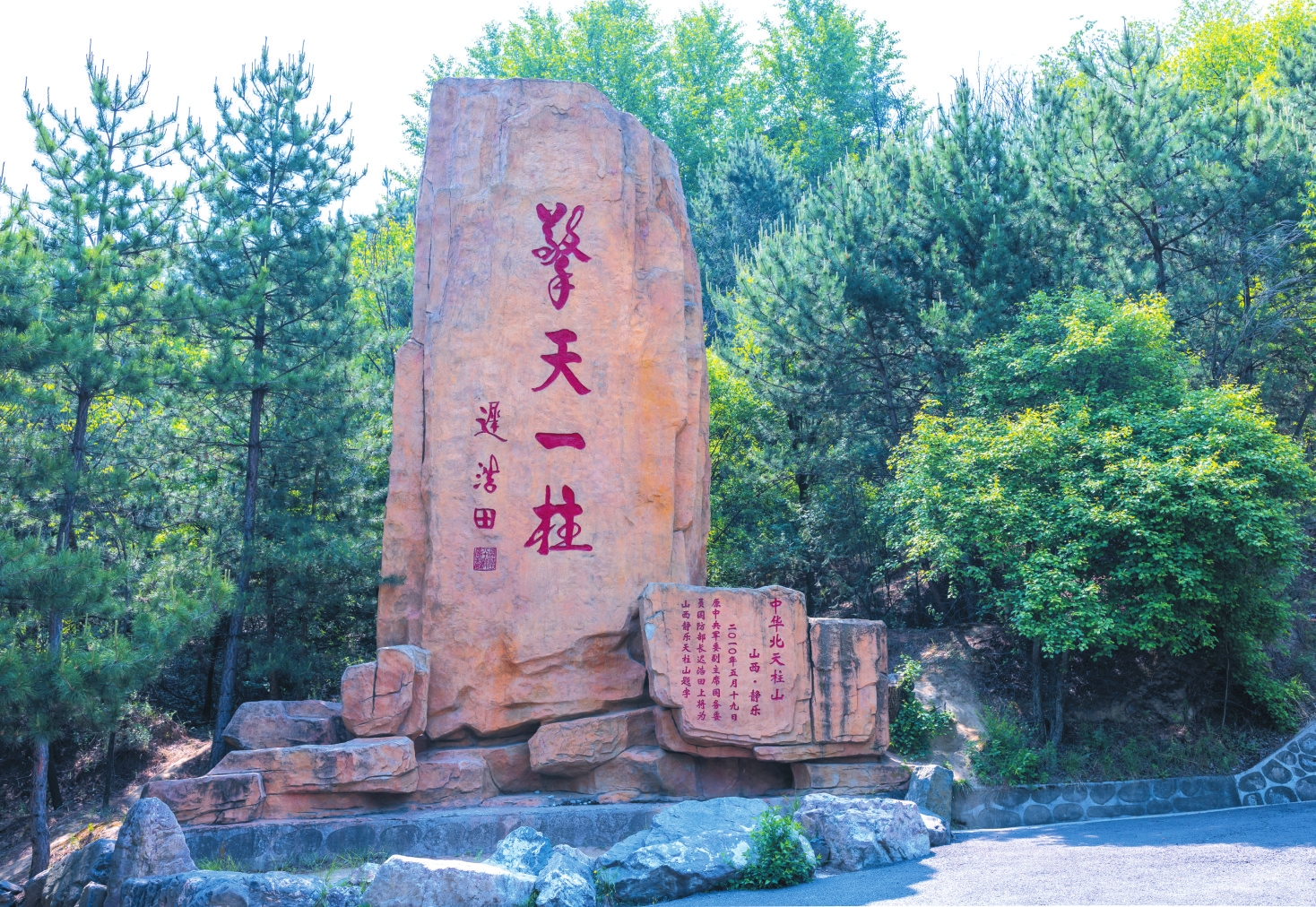 山路向南急轉(zhuǎn)后變得平坦舒緩起來(lái),氣勢(shì)恢弘的建筑群呈現(xiàn)在眼前。右邊護(hù)坡上,是天柱山的“名人墻”,鑲嵌著靜樂(lè)九大名人的肖像,有功蓋千古的賢相,有戰(zhàn)功赫赫的名將,有學(xué)識(shí)淵博的鴻儒,有英勇無(wú)畏的革命者。不遠(yuǎn)處,一塊赭色大石莊嚴(yán)矗立,上面是中央軍委原副主席遲浩田上將于2010年5月為天柱山的題詞:擎天一柱。將軍蒼勁有力的書(shū)法,與山之威武相得益彰。