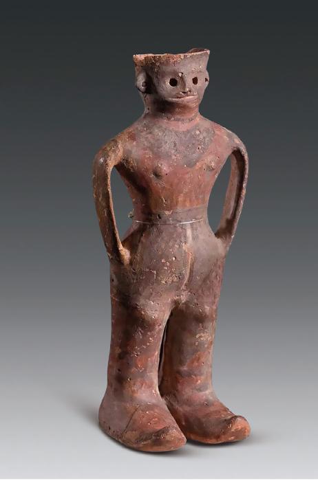 “有一件四壩人形彩陶罐,造型簡(jiǎn)直就是一位又酷又帥的少年?!彼稳莸?,少年留短發(fā)、打鼻釘,脖子上似系著絲巾,身穿高腰網(wǎng)格長(zhǎng)褲裙,雙手插兜,放到今天,也是時(shí)尚少年。