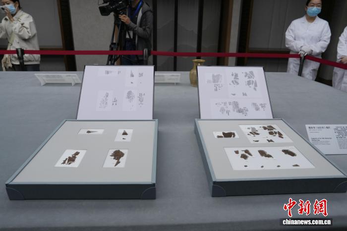 10月13日,流失海外79載的長(zhǎng)沙子彈庫戰(zhàn)國(guó)帛書第二、三卷《五行令》與《攻守占》正式入藏湖南省博物館。圖為楚帛書《五行令》殘片。中新社記者 楊華峰 攝