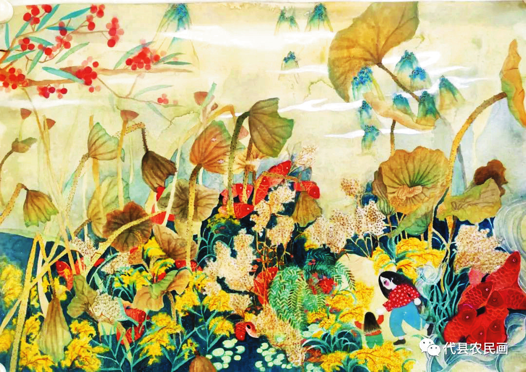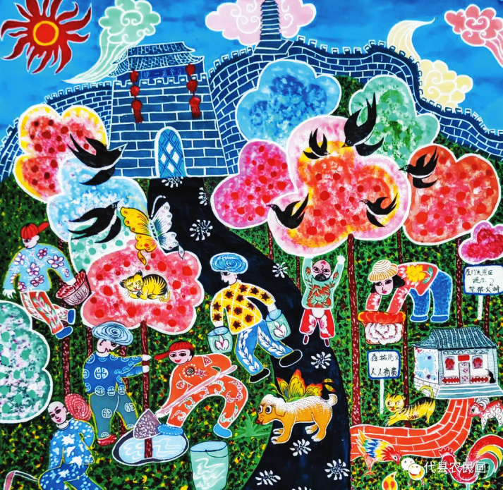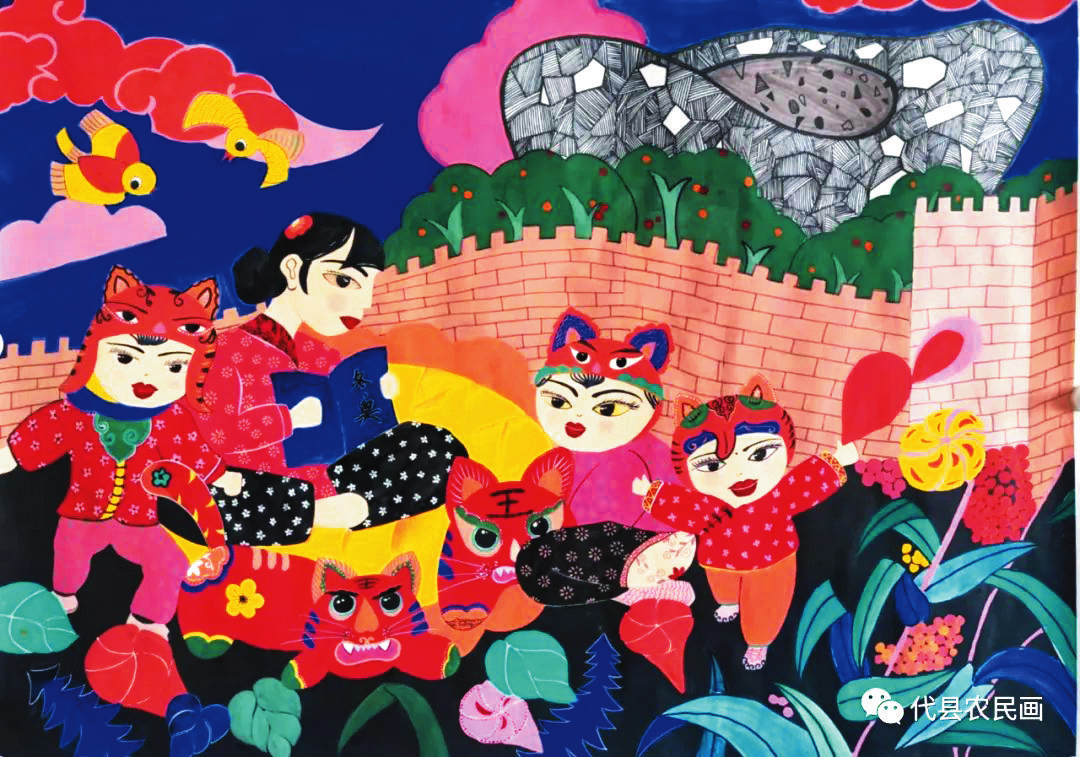 中國歷史文化名城代縣,文化底蘊(yùn)深厚,民俗傳統(tǒng)技藝精巧別致,1988年和2008年先后被文化部授予“中國民間繪畫畫鄉(xiāng)”“中國民間文化藝術(shù)之鄉(xiāng)”。該縣的農(nóng)民畫早在上世紀(jì)80年代初就在全國產(chǎn)生過較大影響,之后經(jīng)歷了一段低迷期。近年來在代縣農(nóng)民畫促進(jìn)會(huì)的推動(dòng)之下,農(nóng)民畫又重新煥發(fā)出耀眼的光彩。先后涌現(xiàn)出多位畫家,其中尤以丁全愛、戴翠平、祁磊、賈永花、郎冬梅等18位女畫家組陣的雁門巾幗,在多年鉆研繪畫技巧的基礎(chǔ)上,創(chuàng)作出一幅幅特色鮮明、獨(dú)具匠心的畫作,成為閃耀三晉大地的矩陣,為傳承、弘揚(yáng)雁門文化做出了新貢獻(xiàn)。