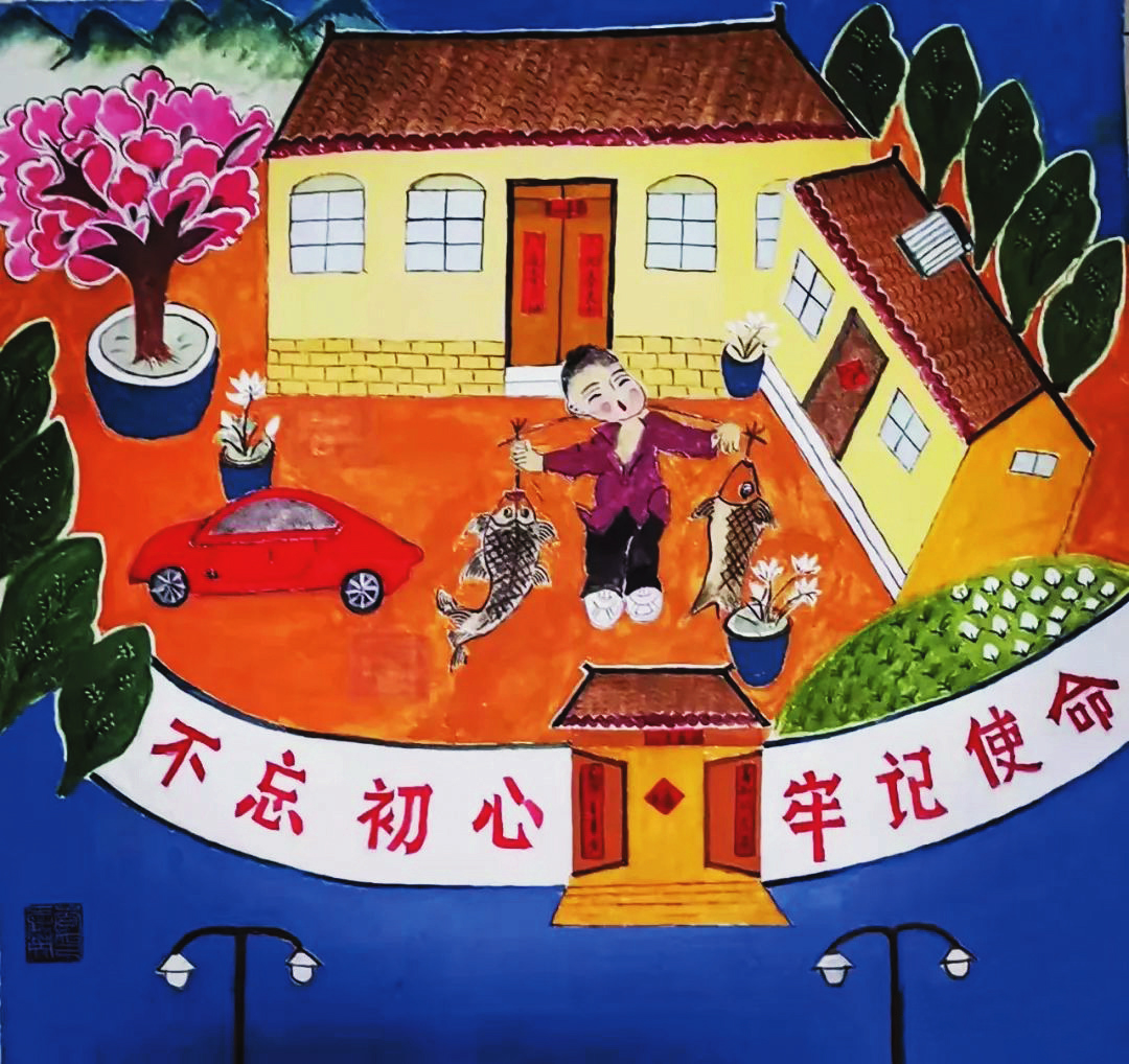 她們的作品,取材于農(nóng)村、農(nóng)業(yè)、農(nóng)民生活,或表現(xiàn)美好的生活場景,或反映豐收的喜悅,或體現(xiàn)鄉(xiāng)愁,在表現(xiàn)手法上采用大膽的夸張、變形,巧用艷麗的色彩,人物刻畫細(xì)致入微,內(nèi)心喜悅躍然紙上,富有鮮明的地方特色。綜觀她們的作品,無不展現(xiàn)了社會(huì)主義新農(nóng)村在新時(shí)代的新變化、新風(fēng)貌,在傳承和弘揚(yáng)代縣文化、引領(lǐng)社會(huì)主義精神文明建設(shè)方面做出了出色的嘗試與實(shí)踐。
