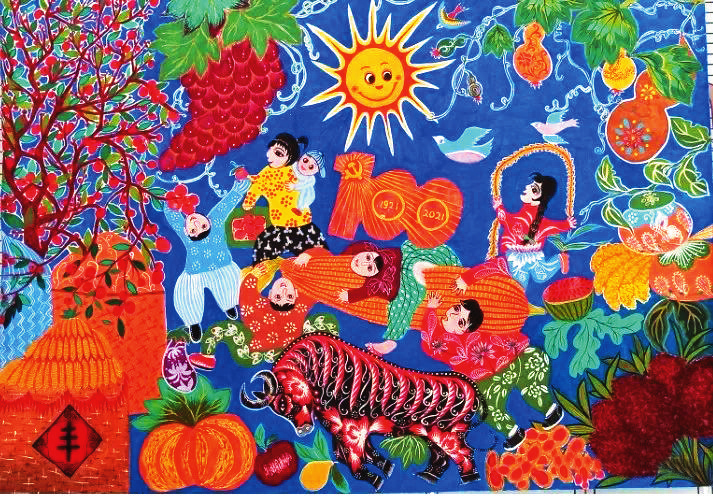 在代縣農(nóng)民畫促進(jìn)會(huì)黨支部和主席團(tuán)的引領(lǐng)下,這些女畫家積極參與促進(jìn)會(huì)組織的各種交流和研討活動(dòng),不斷汲取藝術(shù)養(yǎng)分,深入探索研究農(nóng)民畫的創(chuàng)作技巧,使自己的繪畫技藝逐漸得到提升。她們特別注重借鑒代縣刺繡、面塑、剪紙等民間技藝的創(chuàng)作方法,從各種技藝當(dāng)中吸納有利于農(nóng)民畫創(chuàng)作的元素和營養(yǎng)。